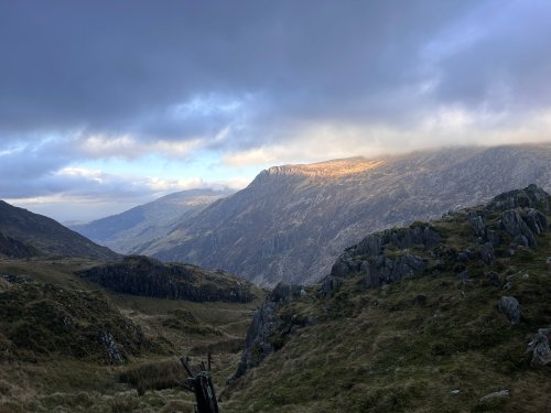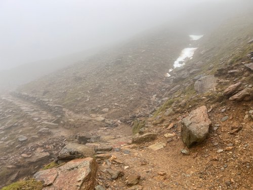 Only two significant patches of snow were seen lying on the PyG (and miners') path, above about 950m, below Bwlch Glas. The snow here was firm for the most part, but with a substantial soft surface, and a sugary path eroded across it.